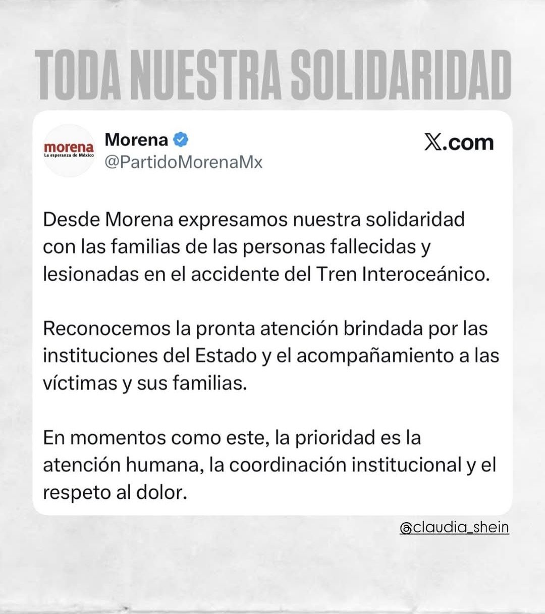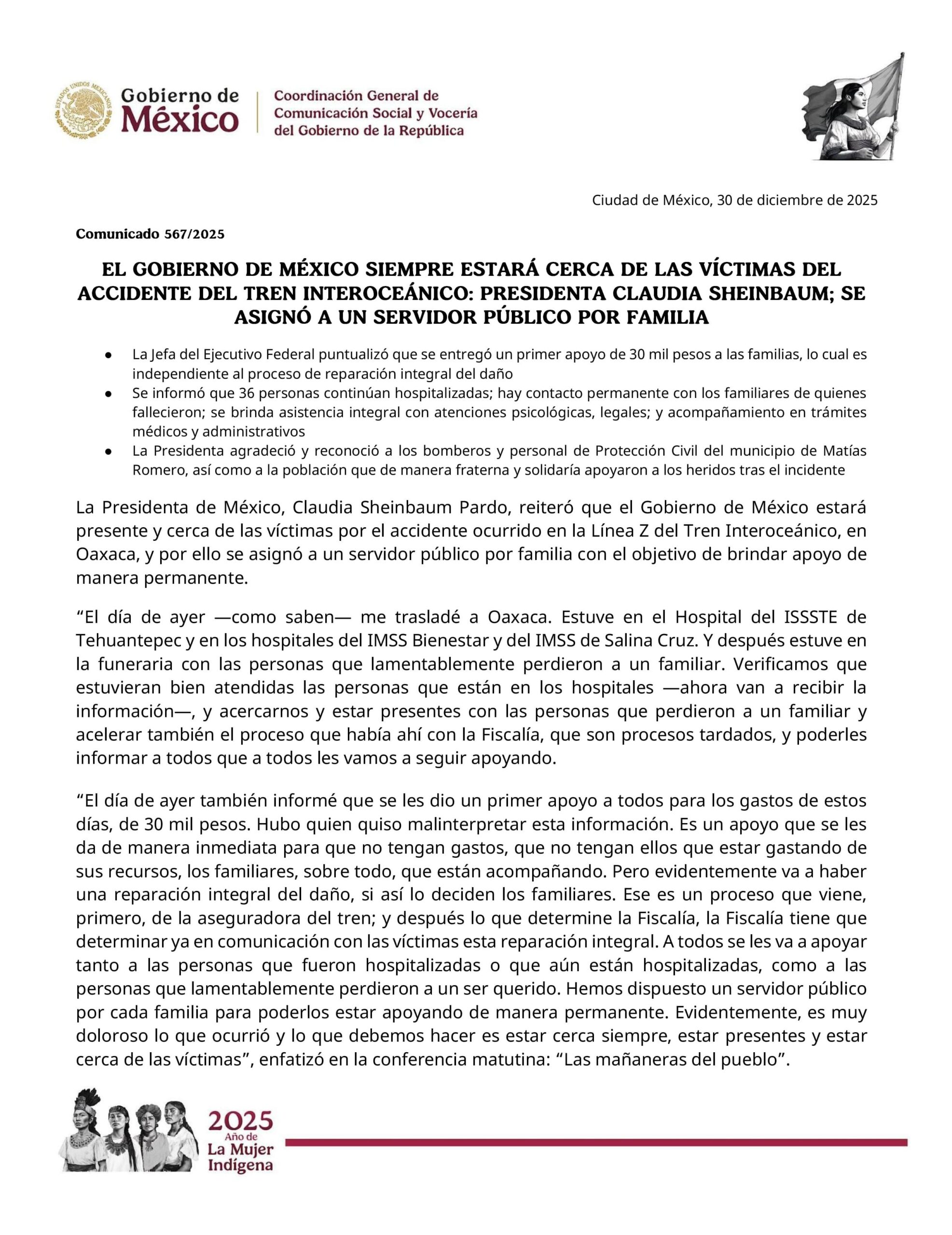 COMUNICADO 567-EL GOBIERNO DE MÉXICO SIEMPRE ESTARÁ CERCA DE LAS VÍCTIMAS DEL ACCIDENTE DEL TREN INTEROCEÁNICO_ PRESIDENTA CLAUDIA SHEINBAUM; SE ASIGNÓ A UN SERVIDOR PÚBLICO POR FAMILIA