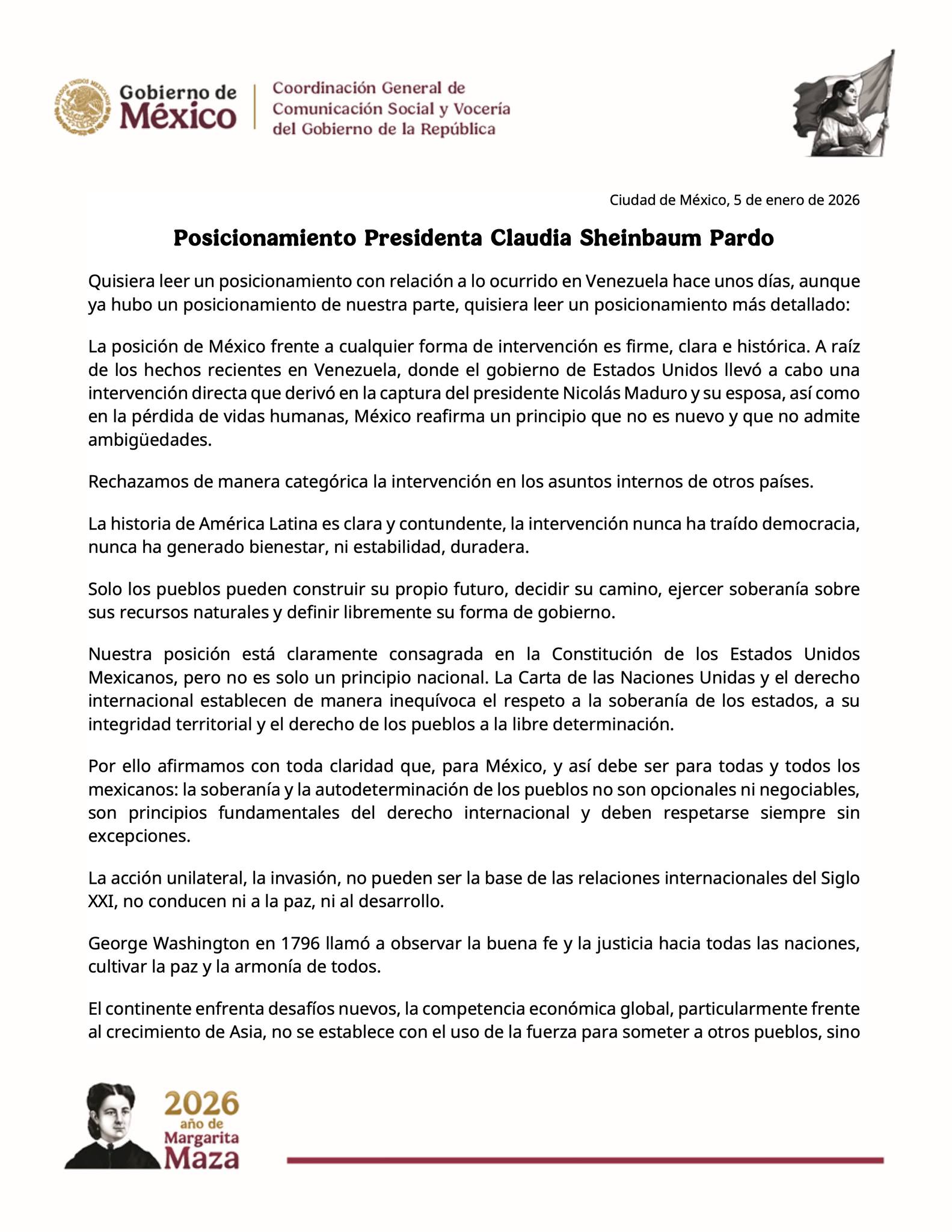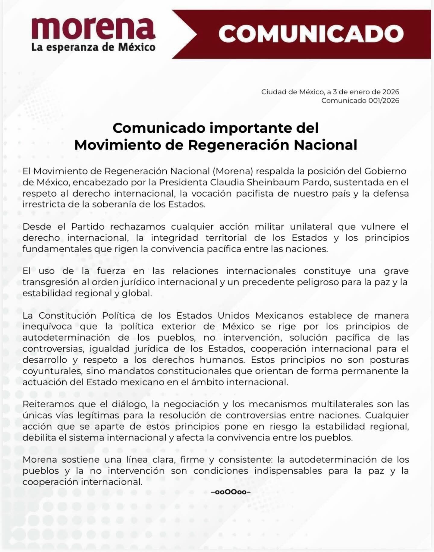 Desde el Comité Ejecutivo Estatal del Estado de México, respaldamos la postura de la presidenta Claudia Sheinbaum Pardo frente a las acciones militares que vulneran los derechos humanos internacionales.
