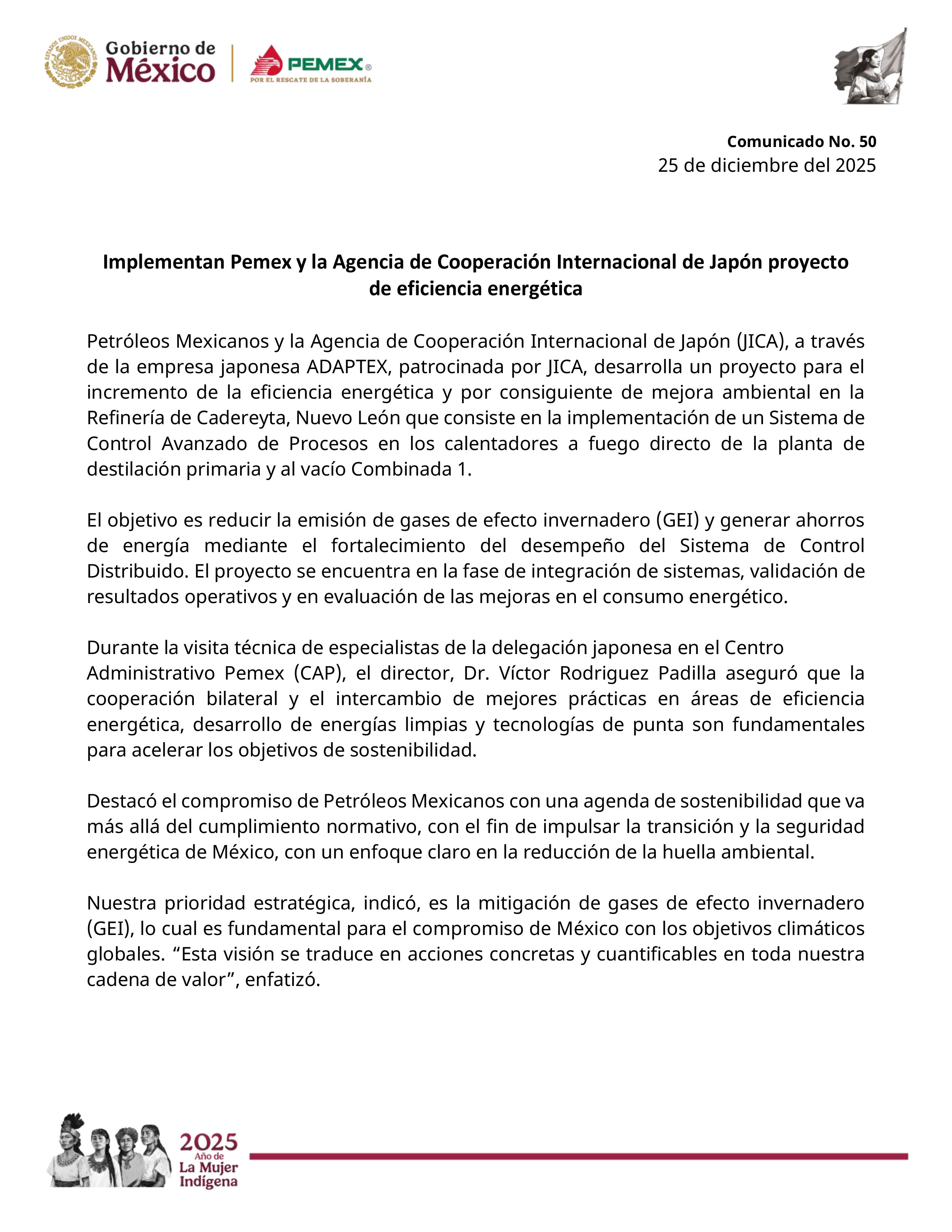 By Morena Edo. Mex|2025-12-25T21:40:41-06:00diciembre 25, 2025|Comentarios desactivados en Comunicado Nacional 50_Implementan Pemex y la JICA proyecto de eficiencia energética